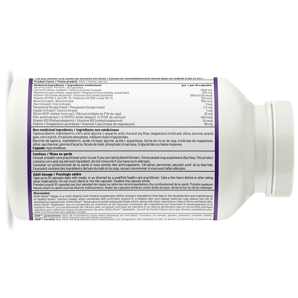 Ortho Bone® Végétalien est une formule de pointe pour la santé des os fournissant des nutriments indispensables au maintien de la solidité des os, en particulier pour les personnes atteintes d’ostéoporose, d’ostéopénie ou ayant déjà subi des fractures osseuses. Ortho Bone® Végétalien diffère de l’Ortho Bone® classique d’AOR en ce qu’il convient aux végétaliens, fournissant les sources non animales et les plus efficaces de calcium, de vitamine D et d’autres nutriments intervenant dans la formation des os.
