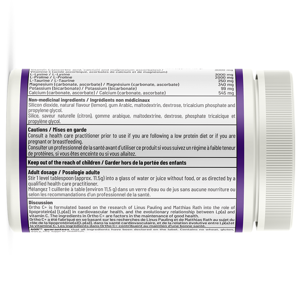 Ortho C+ a été conçu pour préserver de la santé des vaisseaux sanguins en empêchant la formation de plaques artérielles. Une forte dose de vitamine C soutien la production du collagène qui, à son tour, guérit, renforce et protège les artères, en particulier contre le danger potentiel que représente une lipoprotéine circulante connue sous le nom de Lp (a). Le Lp (a) se lie aux vaisseaux sanguins blessés et libère rapidement le cholestérol nécessaire à la régénération de la paroi cellulaire. En effet, c’est ainsi que se forme la plaque d’athérosclérose. La lysine et la proline fournissent d’autres sites de liaison pour le Lp (a), réduisant sa capacité à se fixer aux vaisseaux sanguins et permettant à la vitamine C de faire son travail de guérison. La taurine, le magnésium, le potassium et le calcium sont également indispensables pour le maintien d’un rythme cardiaque régulier et à une bonne fonction musculaire et nerveuse au niveau du cœur.