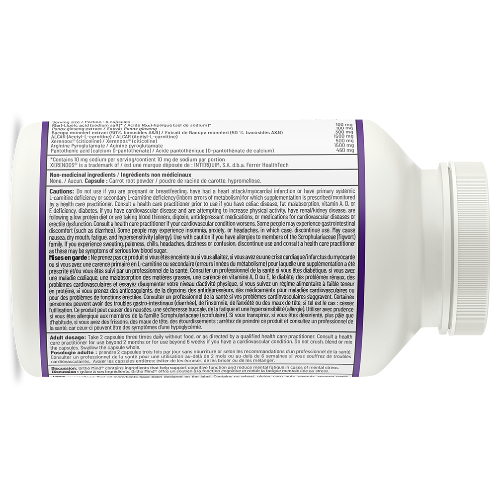 Ortho Mind est une formule avancée pour la santé cognitive contenant des ingrédients synergiques à des doses soutenues par des données de recherche clinique. Il s’agit de : l’acide R-lipoïque, l’acétyl-L-carnitine, la citicoline, la plante ayurvédique Bacopa monnieri, l’acide L-pyroglutamique et la plante asiatique Panax ginseng.