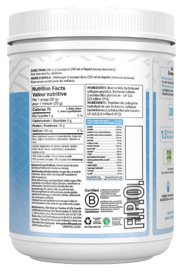 -20 g de peptides de collagène provenant d'animaux nourris à l'herbe et élevés en pâturage par portion de 20 g.