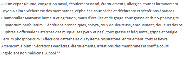Cette formule, approuvée par Santé Canada soulage efficacement les symptômes du rhume d’origine infectieuse ou allergique tels que l’enrouement, les éternuements, les frissons, l’irritation des yeux, la toux, la congestion et l’écoulement des sécrétions nasales.