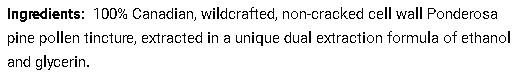 Fabriqué à partir de pollen de pin sauvage, brut et non craquelé récolté dans les forêts vierges de la Colombie-Britannique. Le pollen de pin est la poussière jaune naturelle à l'intérieur des cônes mâles rouges (Ponderosa) et jaunes (Lodgepole). Le pollen de pin vivant, entier et non fissuré contient plus de 200 phytonutriments bioactifs, notamment des antioxydants, des flavonoïdes, des acides aminés, des vitamines, des minéraux et, mieux encore, des phytoandrogènes. Ces hormones mâles à base de plantes - connues sous le nom de brassinostéroïdes - influencent positivement la fonction hormonale humaine.