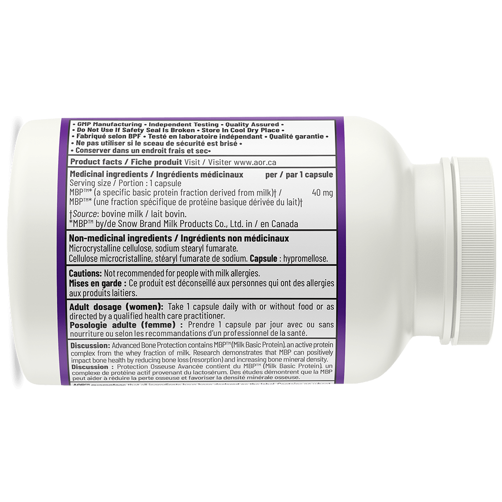 Advanced Bone Protection n’est pas une source de calcium, mais plutôt un complément bénéfique à tout régime de santé à base de calcium favorisant la santé des os. Il peut s’avérer utile pour les personnes à risque de développer (l’) ou souffrant d’ostéoporose. Il favorise également la consolidation osseuse à la suite d’une fracture. La dose thérapeutique journalière recommandée de Protection Osseuse Avancée est offerte dans une petite capsule qui peut être prise à tout moment de la journée, avec ou sans nourriture ou autres suppléments.