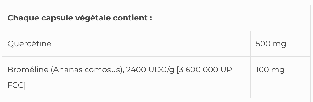 Des études suggèrent que la Bromélaïne peut également améliorer l’efficacité de la Quercétine.
