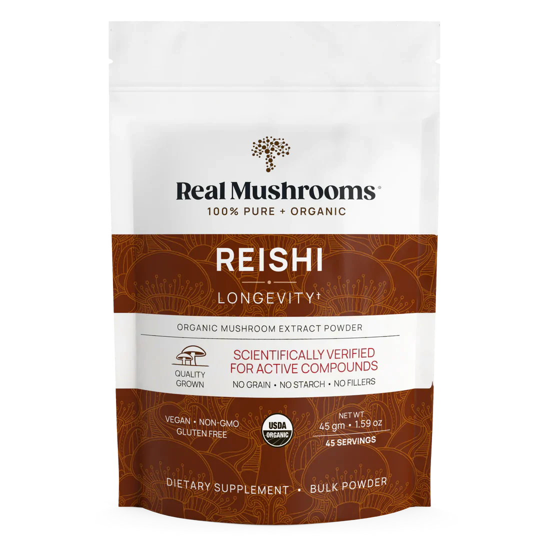Le Real Mushrooms Reishi 415 garantit que leurs produits reishi sont fabriqués à partir du champignon (corps fruitiers) et contiennent des niveaux plus élevés du composé médicinal bêta-d-glucanes, des triterpènes et des charges de grains NO, contrairement à d'autres produits reishi sur le marché. Une façon d'identifier la pureté d'un produit reishi est la couleur foncée et le goût amer.