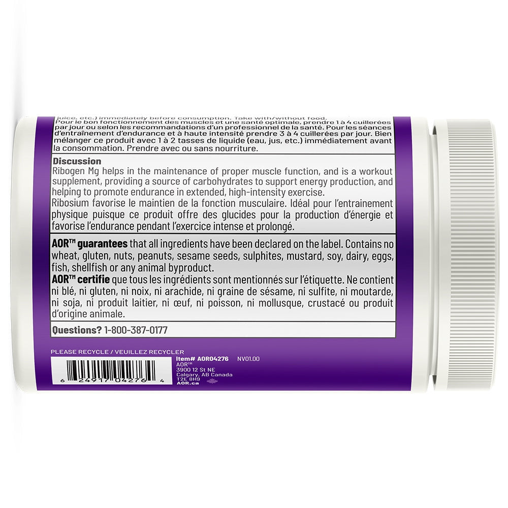 Ribogen Mg d’AOR fournit une combinaison unique de nutriments dans une poudre pratique permettant une posologie flexible pour répondre aux besoins individuels. La dose modérée de magnésium favorise la fonction musculaire et la relaxation sans causer les effets indésirables gastro-intestinaux habituellement observés aux doses plus élevées de magnésium.