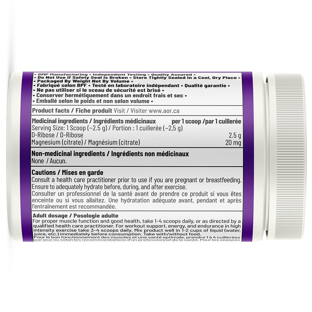 Le D-ribose est un sucre naturel à cinq carbones présent dans toutes les cellules vivantes. C’est un élément constitutif d’acides nucléiques qui sont les éléments de base de l’ADN et de l’ARN. C’est aussi un précurseur de l’adénosine triphosphate (ATP), la « monnaie moléculaire » de l’énergie cellulaire , fournissant de l’énergie pour chaque mouvement et réaction chimique effectués par le corps. Les effets du D-ribose pour l’amélioration de la production d’énergie musculaire en cas d’insuffisance cardiaque, de fibromyalgie et pour la performance physique ont été évalués. Le magnésium est un minéral important aidant également dans la stabilisation de l’ATP et de l’ADN.