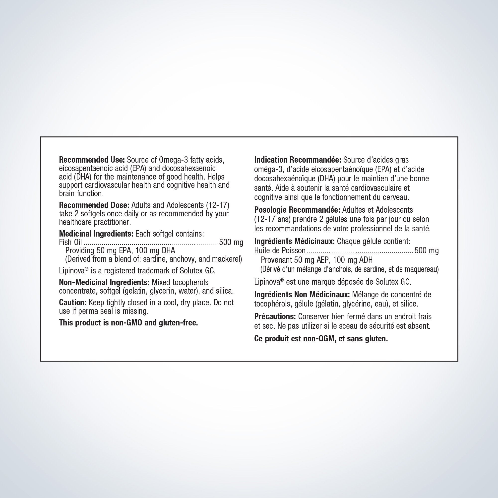 Ingrédients médicinaux: Huile de poisson apportant 50 mg d'EPA, 100 mg de DHA (dérivé d'un mélange de sardines, d'anchois et de maquereaux) ...... 500 mg