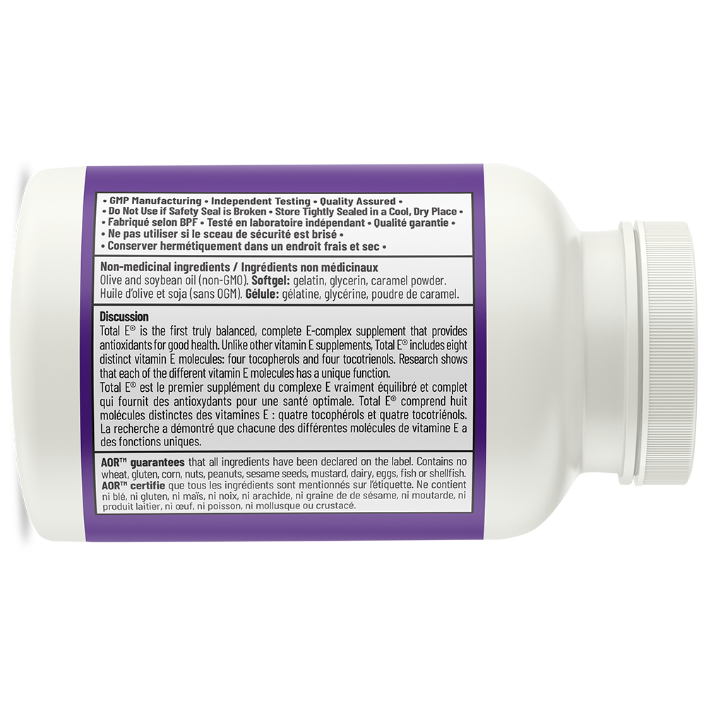Toute personne consommant une supplémentation en vitamine E uniquement à base d’alpha-tocophérol (ou d’une des variantes synthétiques) devrait envisager de passer à cette formule de vitamine E naturelle et à spectre complet. Les personnes à la recherche d’antioxydants, de soutien pour la santé de la peau et la gestion du cholestérol peuvent également tirer profit de la consommation de Total E.