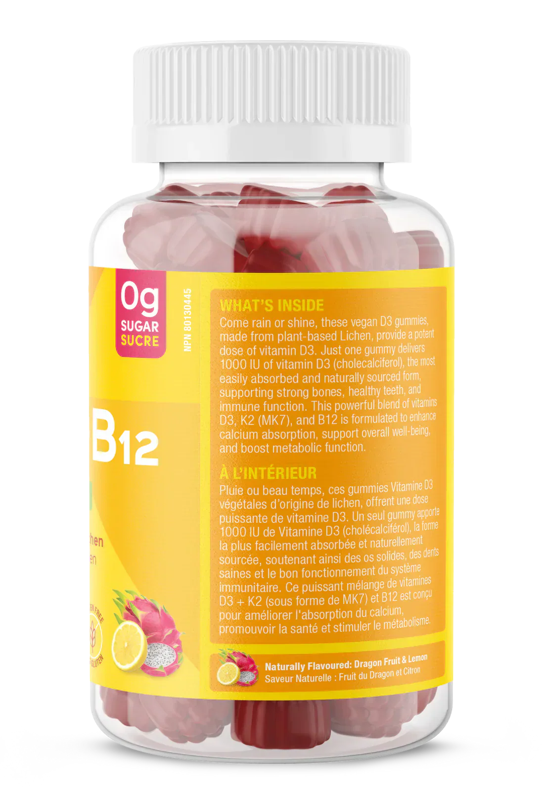 Qu'il pleuve ou qu'il vente, ces gélifiés D3 végétaliens, fabriqués à partir de lichen végétal, fournissent une puissante dose de vitamine D3. Un seul gélifié fournit 1000 UI de vitamine D3 (cholécalciférol), la forme la plus facilement absorbée et d'origine naturelle, qui favorise la solidité des os, la santé des dents et la fonction immunitaire. Ce puissant mélange de vitamines D3, K2 (MK7) et B12 est formulé pour améliorer l'absorption du calcium, soutenir le bien-être général et stimuler la fonction métabolique.