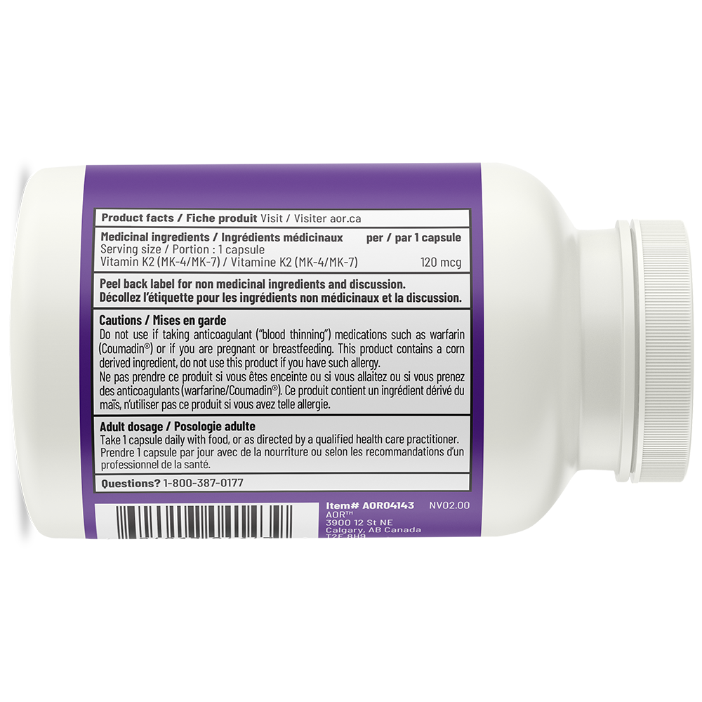 La vitamine K est une vitamine indispensable à la santé cardiovasculaire, osseuse et hépatique. La vitamine K2 est plus efficace que la vitamine K1, une forme trouvée dans les plantes pour ces effets spécifiques sur la santé. Il existe deux formes efficaces et populaires de vitamine K2 : MK-4 et MK-7. Bien que la MK-4 soit la forme active de la vitamine K2 utilisée par l’organisme et utilisée cliniquement au Japon depuis des décennies avec de bons résultats, il a également été démontré que la MK-7 donne de bons résultats à faible dose et de manière prolongée. La vitamine K2 d’AOR fournit un mélange 50/50 de MK-4 et MK-7 pour assurer le meilleur des deux mondes.