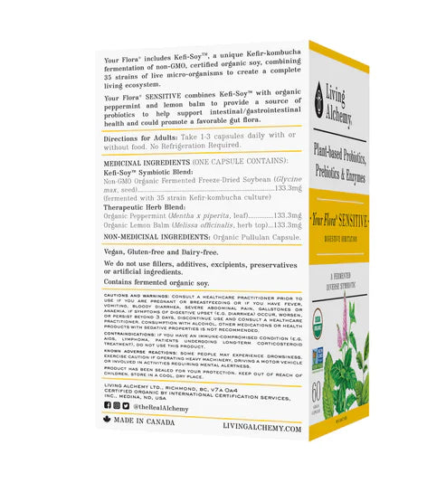 Votre Flore SENSIBLE combine notre culture symbiotique vivante de diverses souches de micro-organismes avec la menthe poivrée et de la mélisse biologiques pour ceux qui nécessitent un soutien de pour ceux dont le tube digestif est sensible ou irrité et qu’un soutien intestinal s’avère nécessaire.