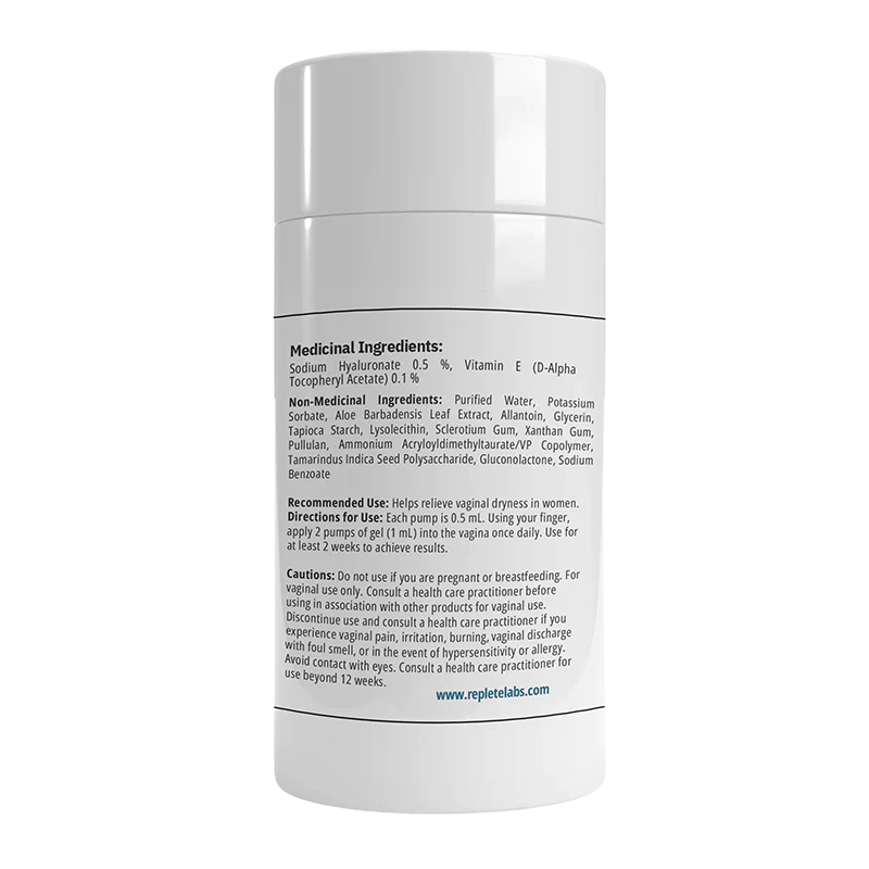 L'hydratant pour la vulve et le vagin VVM est composé d'acide hyaluronique et de vitamine E pour rétablir l'hydratation naturelle des cellules de la peau de la vulve et de la paroi vaginale. Approuvé par Santé Canada avec le NPN (numéro de produit naturel) 80115673.