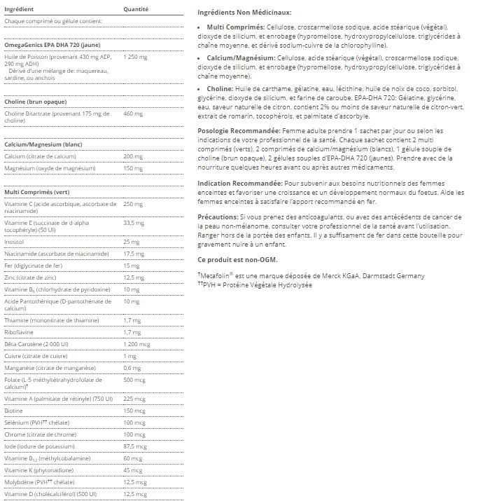 Adultes : Prendre 1 sachet par jour ou selon les indications de votre professionnel de la santé. Chaque sachet contient 2 multi comprimés (verts), 2 comprimés de calcium/magnésium (blancs), 1 gélule souple de choline (brun opaque), 2 gélules souples d’EPA-DHA 720 (jaunes). Prendre avec de la nourriture quelques heures avant ou après autres médicaments.