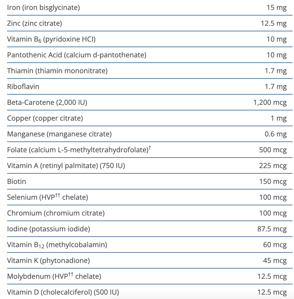 Comprimés multiples : Cellulose, croscarmellose sodique, acide stéarique (végétal), dioxyde de silicium et enrobage (hypromellose, hydroxypropylcellulose, triglycérides à chaîne moyenne et chlorophylline de cuivre sodique).Calcium/Magnésium : Cellulose, acide stéarique (végétal), croscarmellose sodique, dioxyde de silicium et enrobage (hypromellose, hydroxypropylcellulose, triglycérides à chaîne moyenne).Choline : Huile de carthame, gélatine, eau, lécithine, huile de coco, sorbitol, glycérine, dioxyde de silicium et poudre de caroube.