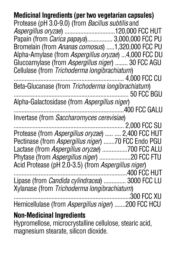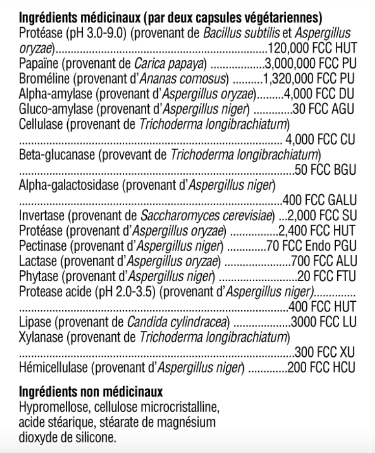 Protéase (pH 3,0-9,0) (de Bacillus subtilis et Aspergillus oryzae) ...... 120 000 FCC HUTPapain (de Carica papaya) ...... 3 000 000 FCC PUBromélaïne (de Ananas comosus) ...... 1 320 000 FCC PUAlpha-Amylase (de Aspergillus oryzae) ...... 4 000 FCC DUGlucoamylase (d'Aspergillus niger) ...... 30 FCC AGUCellulase (de Trichoderma longibrachiatum) ...... 4 000 FCC CUBeta-Glucanase (de Trichoderma longibrachiatum) ...... 50 FCC BGUAlpha-Galactosidase (d'Aspergillus niger) ...... 400 FCC GALUInvertase (de Saccharomyces cerevisiae) ...... 2 000 FCC SUProtease (d'Aspergillus oryzae) ...... 2 400 FCC HUTPectinase (d'Aspergillus niger) ...... 70 FCC Endo PGULactase (d'Aspergillus oryzae) ...... 700 FCC ALUPhytase (de Aspergillus niger) ...... 20 FCC FTUProtease Acide (pH 2.0-3.5)(de Aspergillus niger) ...... 400 FCC HUTLipase (de Candida cylindracea) ...... 3000 FCC LUXylanase (de Trichoderma longibrachiatum) ...... 300 FCC XUHemicellulase (de Aspergillus niger) ...... 200 FCC HCU
